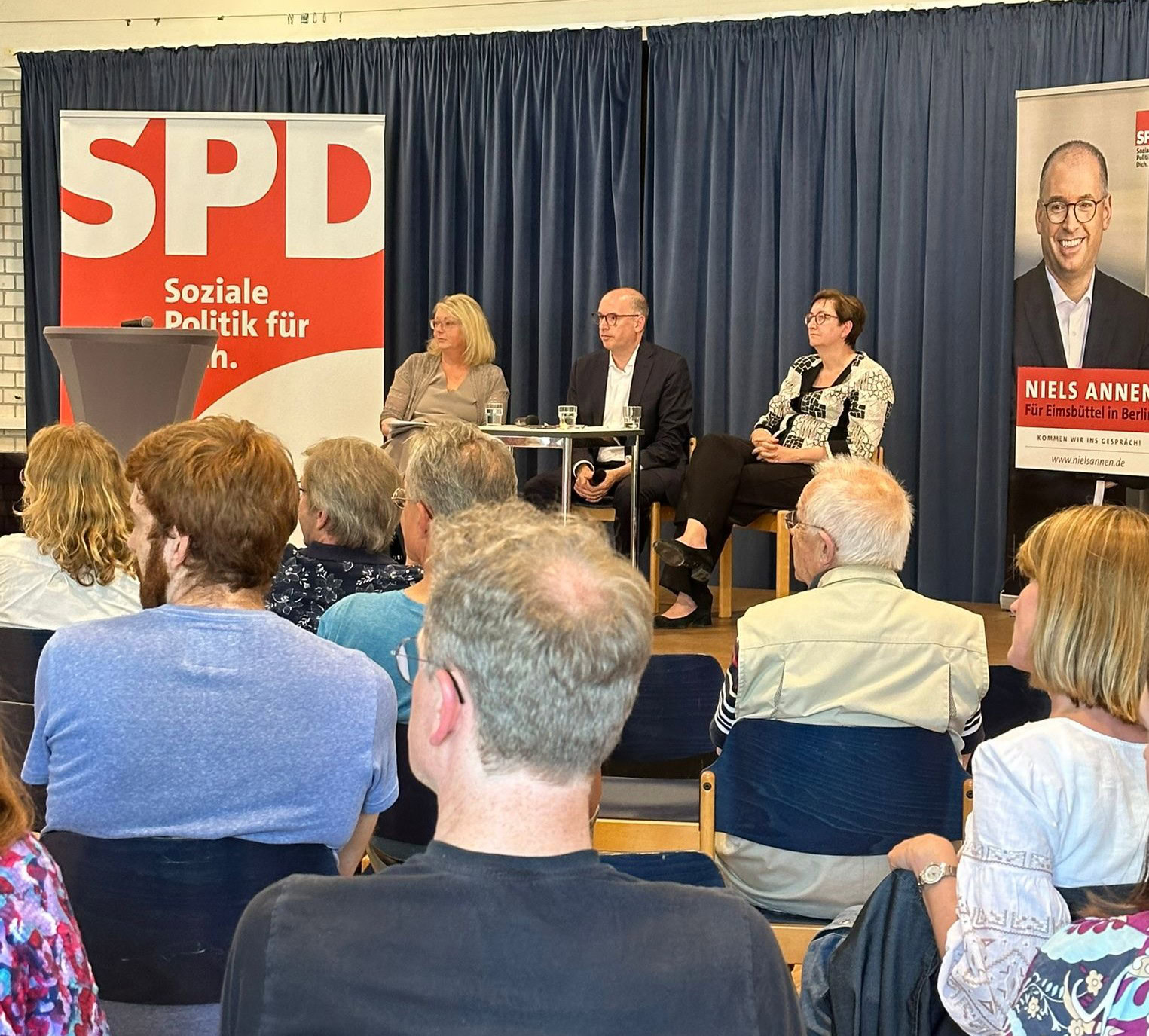 „Handeln für bezahlbares Wohnen“ – zu diesem wichtigen Thema war Bundesbauministerin Klara Geywitz ins Freizeitzentrum Schnelsen gekommen, um mit Niels Annen, der Eimsbütteler Bürgerschaftsabgeordneten Martina Koeppen und vielen interessierten Besucherinnen und Besuchern über die Anstrengungen auf Landes- und Bundesebene für eine Entlastung des angespannten Wohnungsmarktes zu sprechen.