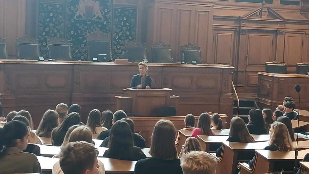 Zum Schluss ging es dann für alle noch einmal in den Plenarsaal, wo unsere Bürgerschaftspräsidentin Carola Veit sich auch sehr über die große Zahl freute, eine kurze Rede hielt und ebenso noch zahlreiche Fragen beantwortete.