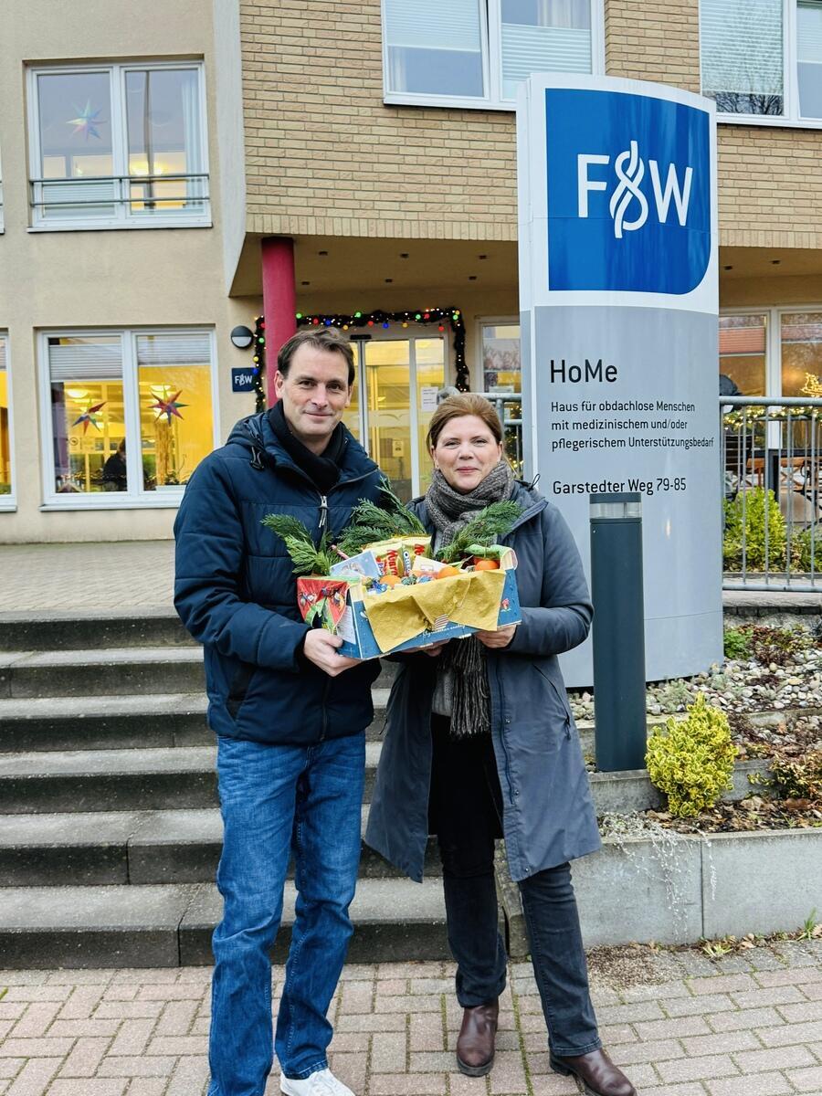 Der Weg führte uns dabei u. a. erneut zur Unterkunft für pflegebedürftige Wohnungslose am Garstedter Weg, wo wir einen Präsentkorb für die dortigen Mitarbeitenden sowie die Bewohnerinnen und Bewohner vorbeigebracht haben und uns ein wenig über die aktuelle Situation in der Einrichtung austauschen konnten.